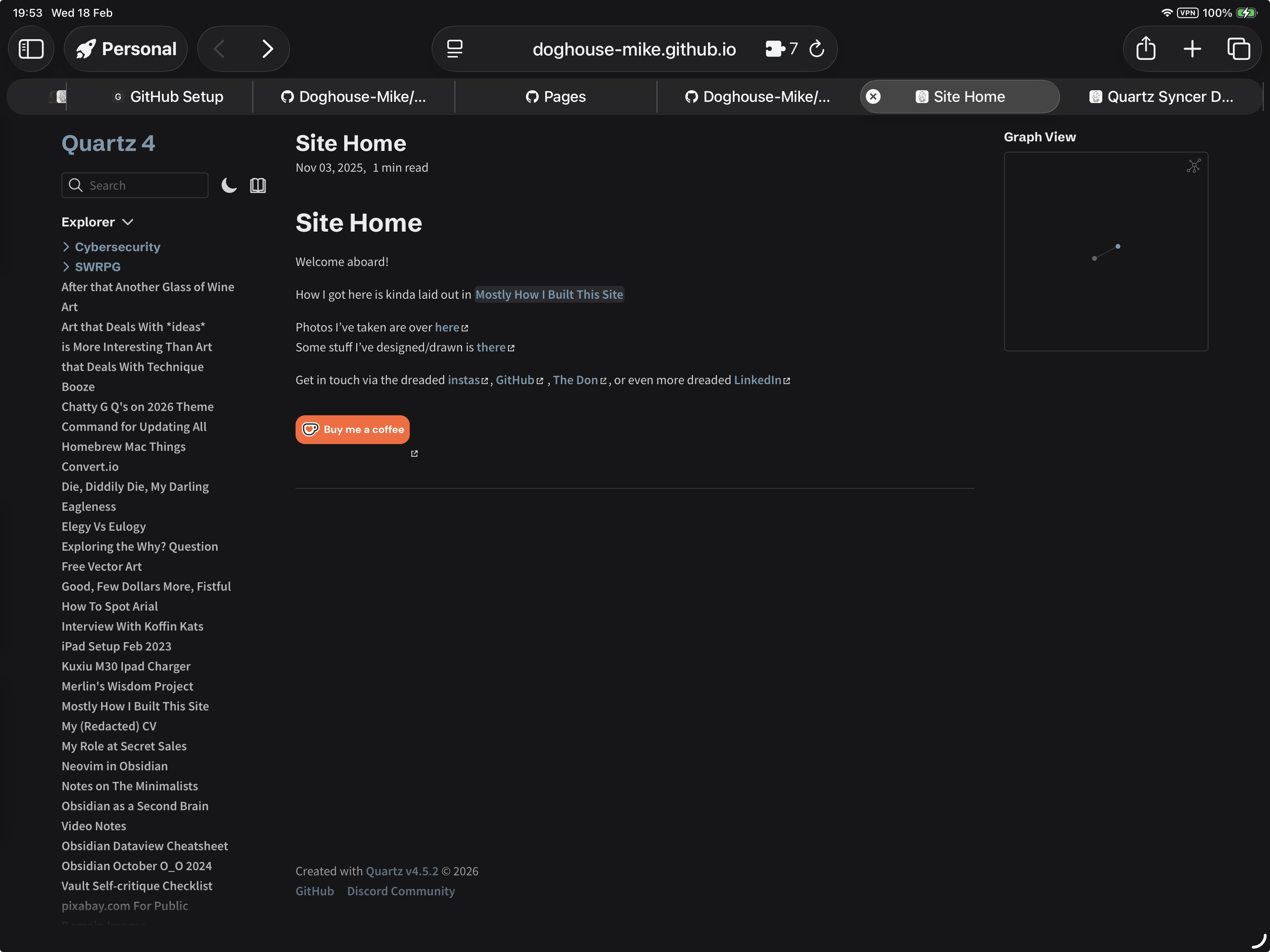 This would be where I recall some parts from the official docs around tweaking quartz.config.ts with domains, comments, setting up themes etc. Some of which is covered in Mostly How I Built This Site but you get what you get.