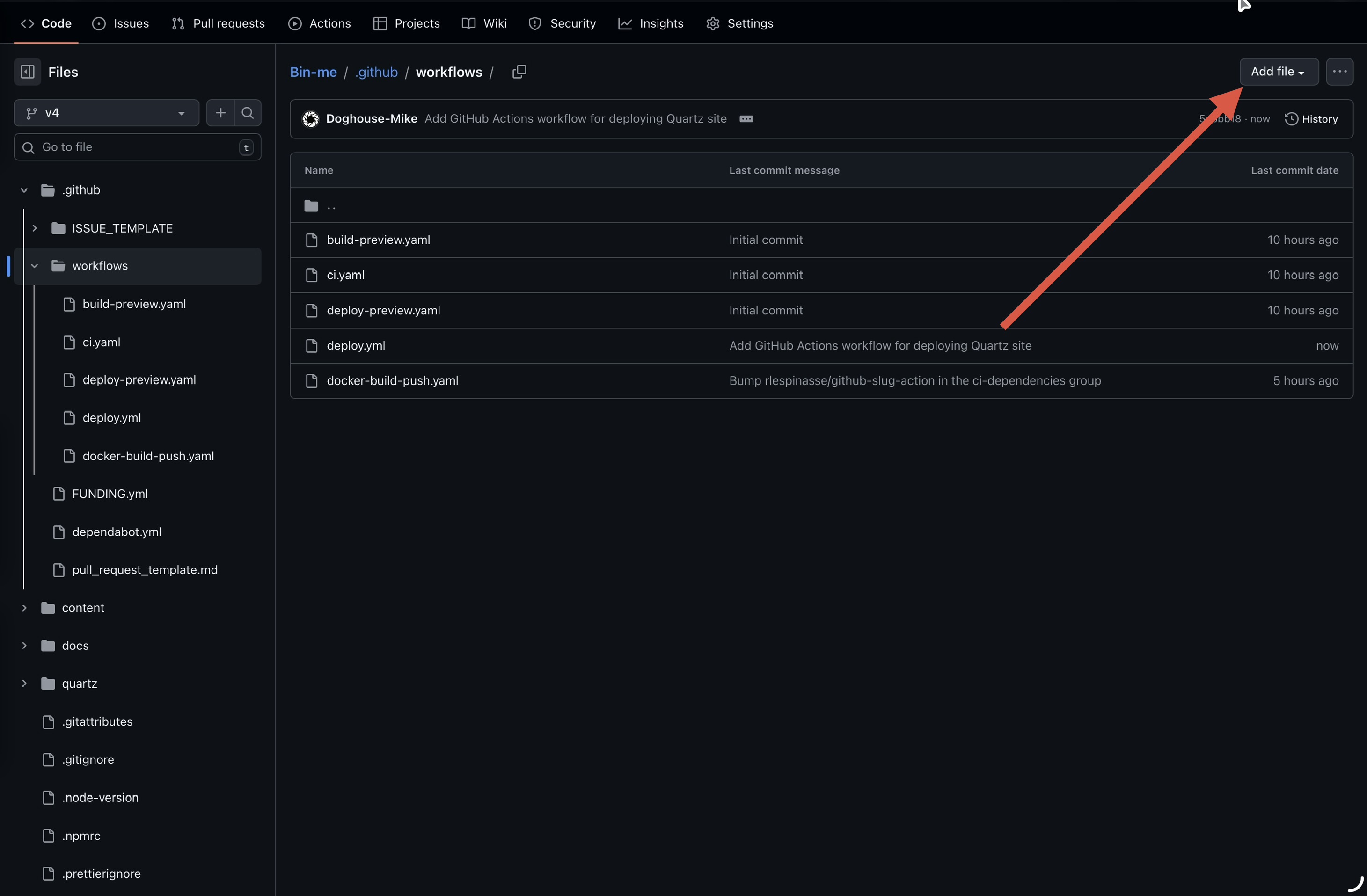 Then ya want that .github/workflows folder, then “Add file” (top right)